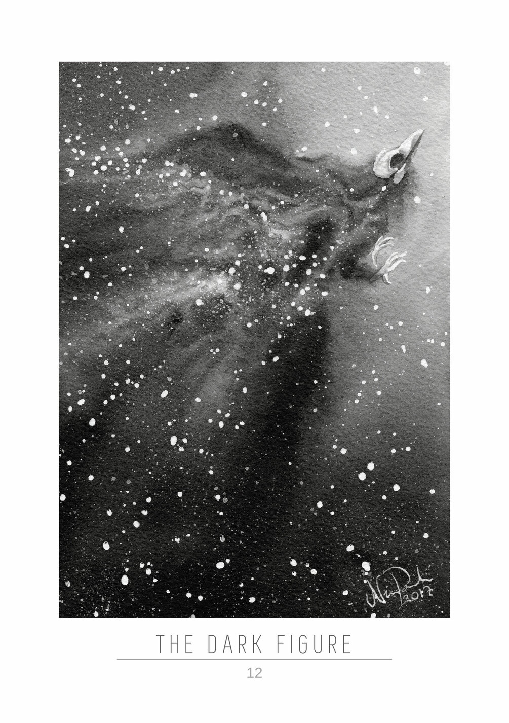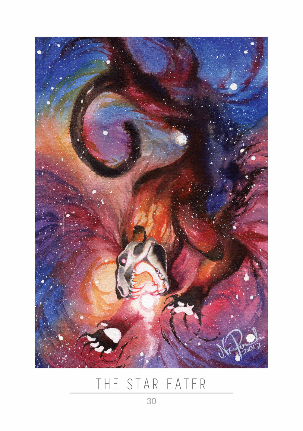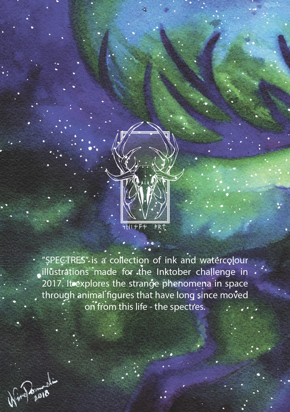 "SPECTRES" is a collection of traditional ink and watercolour paintings made in October 2017 for my personal drawing challenge. I used a custom prompt list to create a series of illustrations that explore the various phenomena in space through skeletal animal figures.